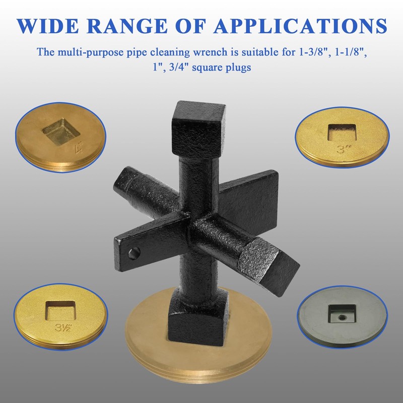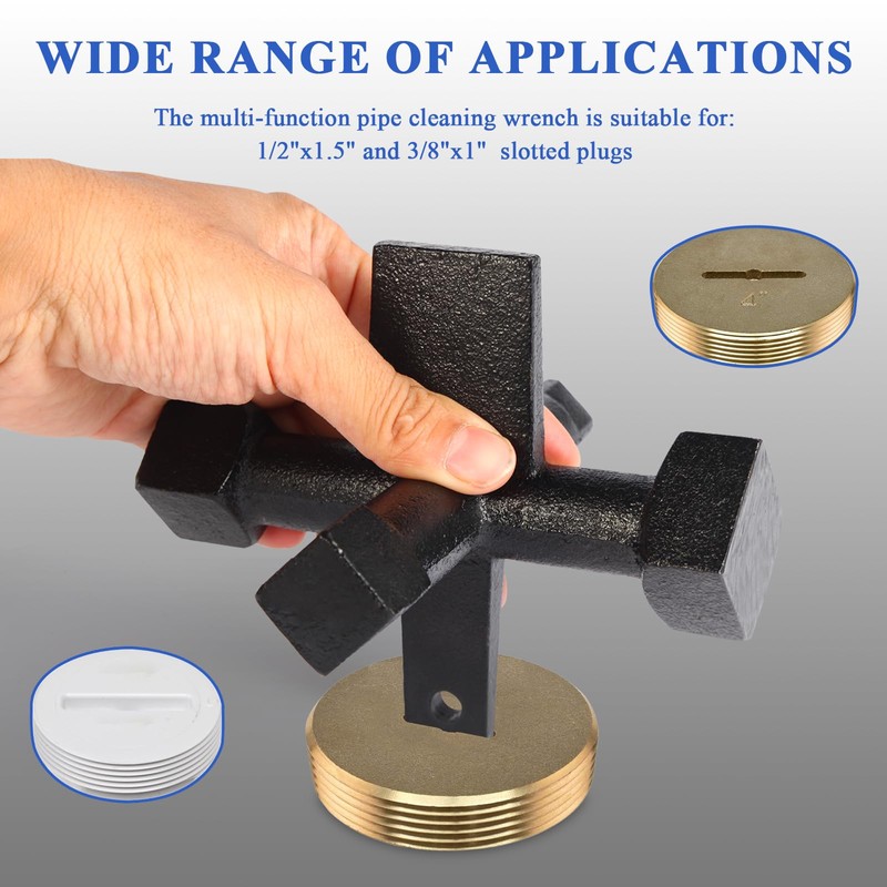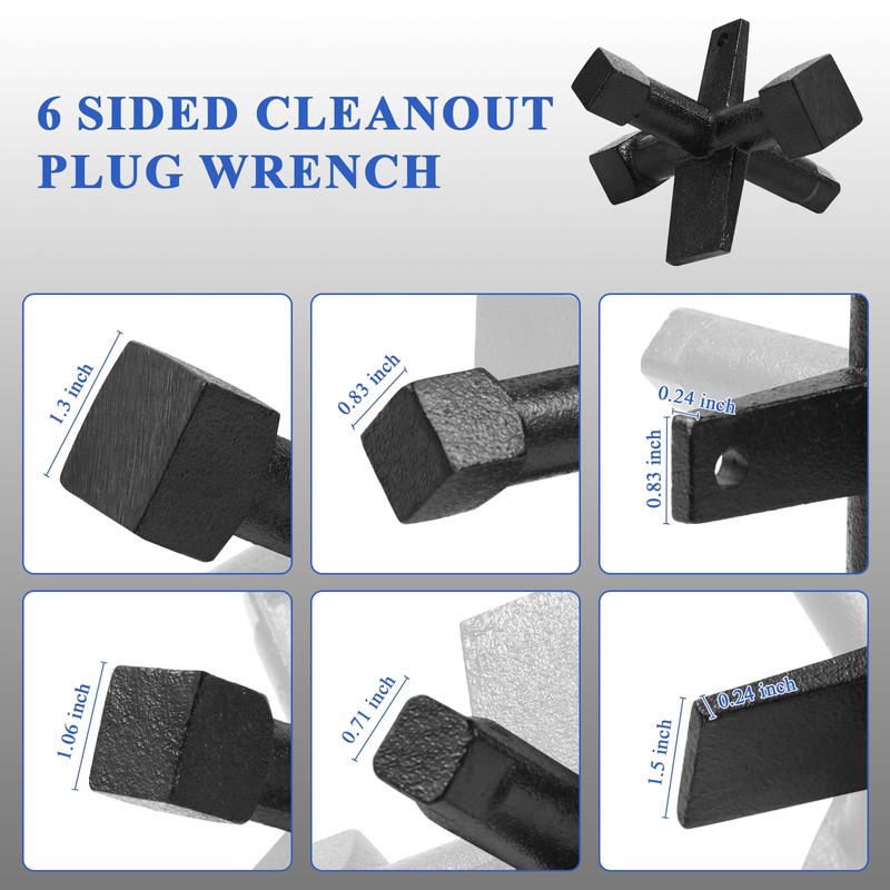 - 【6 Sided Cleanout Plug Wrench Compatibility】This heavy-duty Cleanout Plug Wrench features a 6-sided design for effortless compatibility with both slotted and square countersunk plugs. With six head sizes (0.79", 0.93", 1.16", 1.33" for square plugs; 0.25"x1" and 0.5"x1.5" for slotted plugs), it securely grips stubborn caps in pipes ranging from 1.5” to 8”. Ideal for plumbing, downspouts, sewers, or pool systems, it’s a versatile staple in Plumbing Wrench Tools.
