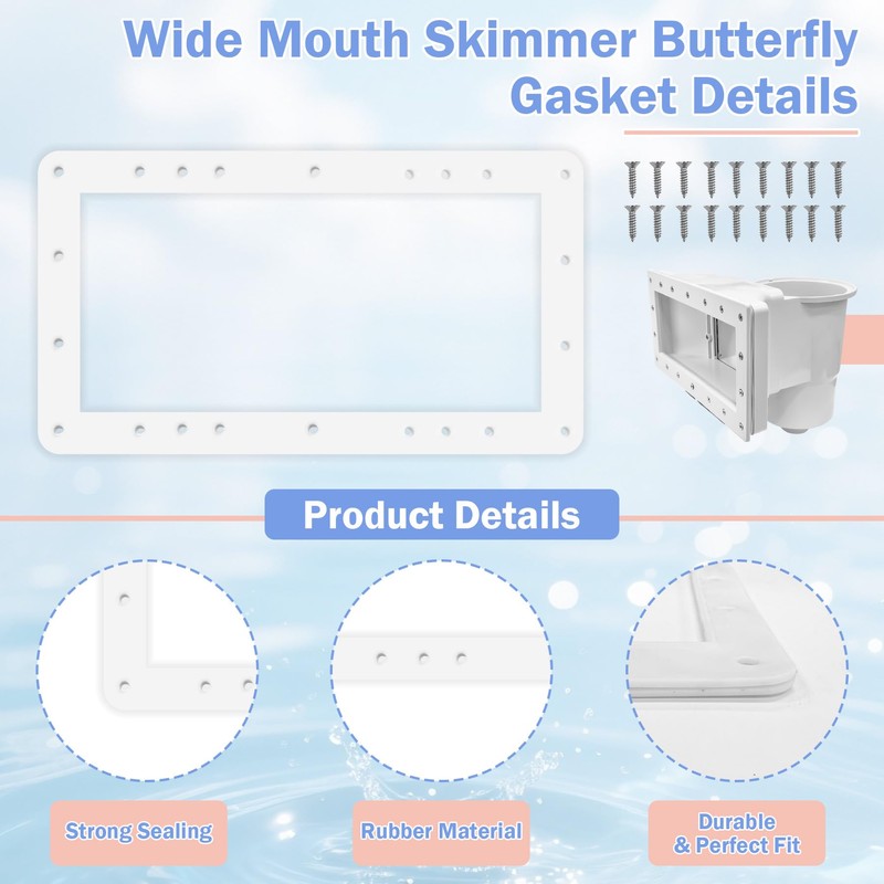 - Wide Mouth Skimmer Butterfly Gasket Packaging Instructions: One piece of wide mouth skimmer butterfly gasket, 18skimmer plate screws, if you have any questions, please contact us, we can help you solve the problem!