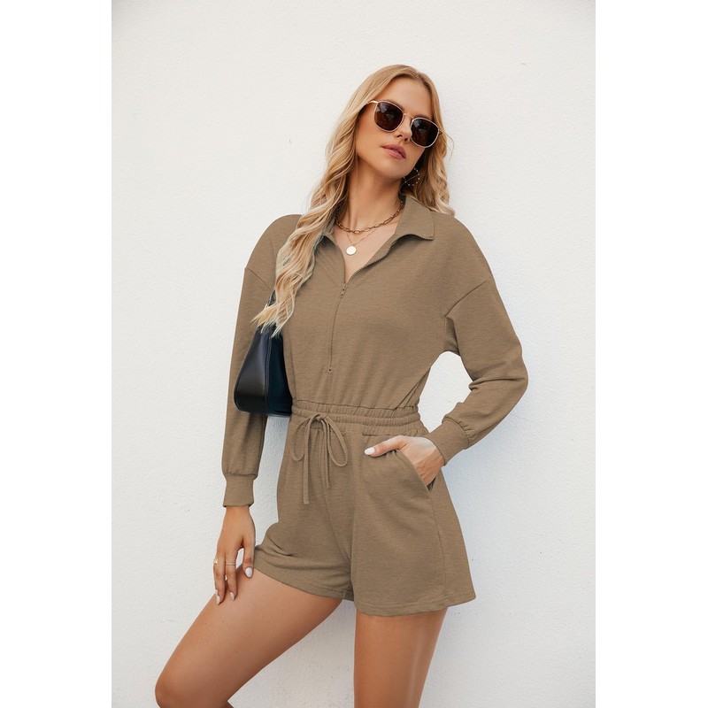 - Casual zip up shorts romper, half zipper,v neck,turn down collared, long sleeve, ribbed cuffs
