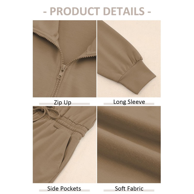 Fixmatti Women One Piece Zip up Romper Shorts Jumpsuit Long Sleeve Collared V Neck Zipper Drawstring Waist Outfits Khaki L