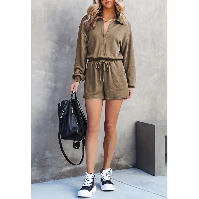 - Zipper v neck drawstring waist romper, Long sleeve mini shorts casual jumpsuit with pockets