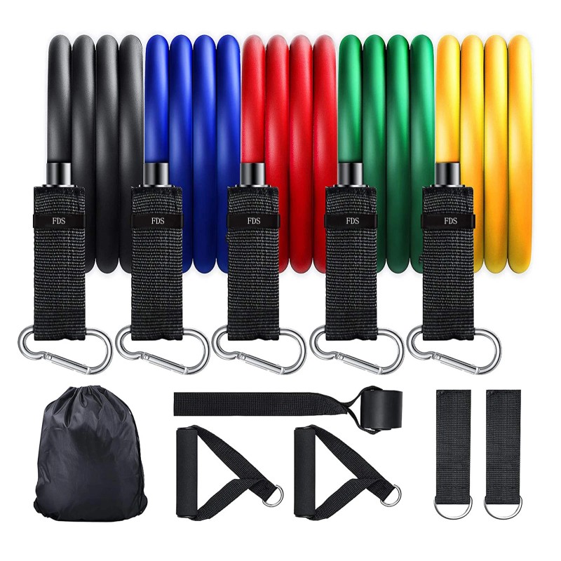 [Complete Set for Versatile Workouts] This FixtureDisplays Resistance Band Set comes with five stackable resistance bands, two soft-grip handles, a door anchor, ankle strap, exercise manual, and a convenient carrying bag. This comprehensive kit is perfect for achieving a wide variety of workouts at home or on the go.