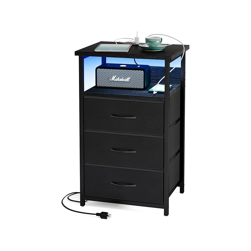 Fixwal Night Stand with Charging Station, LED Nightstand with U-S-B Ports and Outlets, 3 Fabric Storage Drawers with PU Finish, Bedside Table, Black