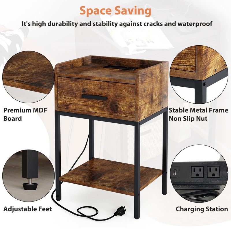Fixwal Nightstand with Charging Station, Bedside Table with USB Ports and Outlets for Bed, 3-Tier End Table with Drawer Storage for Living Room Bedroom, Rustic Brown