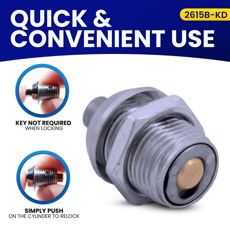 **Easy-to-Use** Miniature enclosure locks are designed for use in tablet enclosure cases, or metal sliding doors. Complete with a spring loaded pop out cylinder, it requires no key when locking. Simply push on the cylinder to relock. Miniature push locks are ideal for a wide variety of uses. With a bolt throw of 3/16”, the miniature tubular push lock is perfect for smaller material thicknesses, up to 1/8”. The miniature lock is only available with key retaining feature (the key can only be removed when the lock is in locked mode.