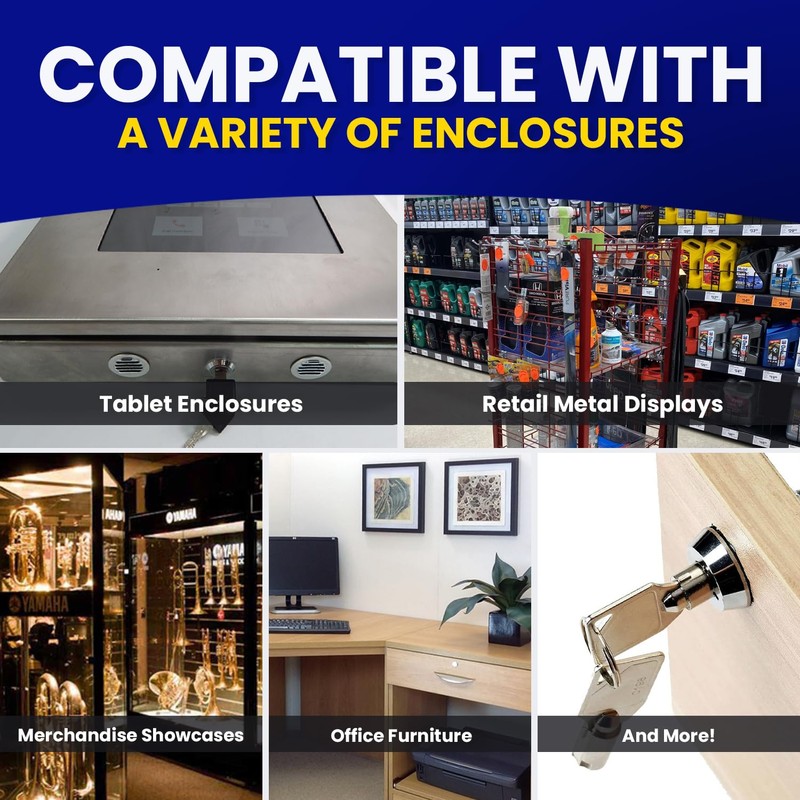 **Easy Installation** Miniature enclosure push locks are a perfect security solution for tablet enclosures in the retail, healthcare and business industries. Lock works on material up to 1/8” thick (which is most metal retail sliding doors or tablet enclosures). Housing made of zinc alloy with a brass barrel end, the miniature push lock is easy to install and comes with a high security tubular keyway.