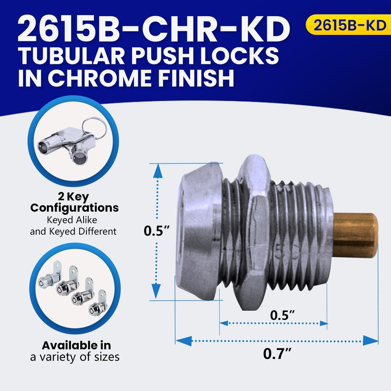 FJM Security 2615B-KD Miniature Tubular Push Locks, Cabinet Locks, BAB Proofing Solution, Door Lock and Drawer Lock for Home Improvement, Keyed Different, Chrome Finish