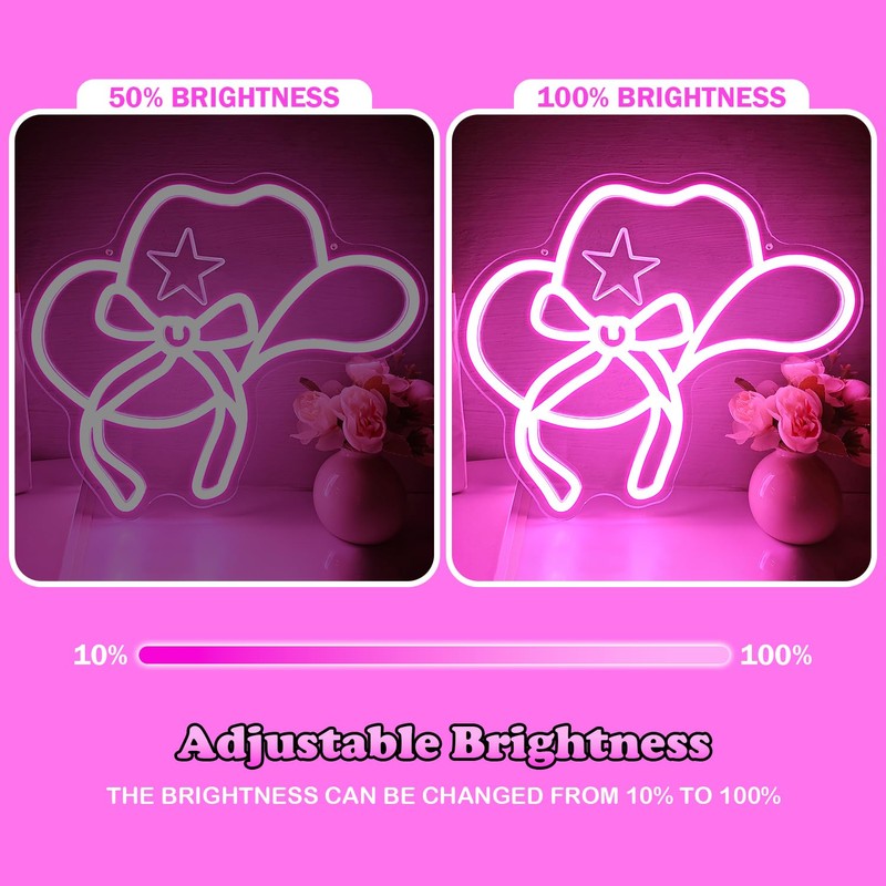 - Bow Hat Neon Sign:Cowgirl hat neon light sign made of pink cowgirl hat and bow light up sign,retro neon cowgirl hats show a unique western style.Add a special bright color to your life and fill your space with a romantic and retro atmosphere