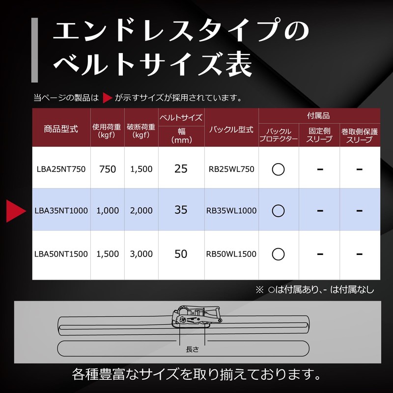 - Model: LBA35NT1000 Belt Size: Width 1.4 inches (35 mm) x Length 13.3 ft (6 m), Buckle Shape: Ratchet Type, Tip Shape: Endless Belt Material: 100% Polyester, Quantity: 1