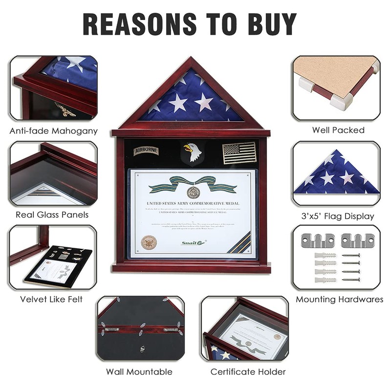 - PREMIUM QUALITY WITH RELIABLE FEATURES - MADE OF solid wood with Anti-fade MAHOGANY Finish, SNAIL Flag Display Case is durable enough for a long-lasting working life. SCRATCH RESISTANT Real glass panel with 95% transparency, VELVET Like Felt Lining along with Certificate and Document Holder can well protect your precious folded 3'x5' Army Navy Air Force Veterans Home Flown Flags and valuable Badges and Medals. Stand on Counter Top or Wall Mountable with metal brackets on back, ready for hanging