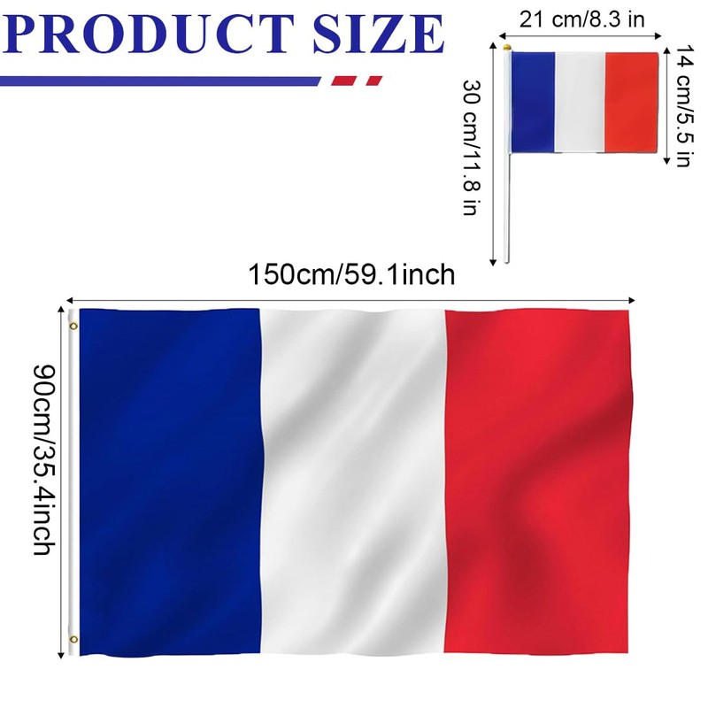 - The product contains a French flag measuring 90 x 150 cm and 10 French hand flags 14 x 21 cm, ideal for sporting events such as the Olympic Games and football games.