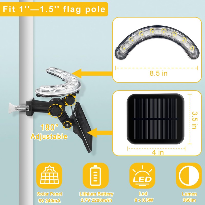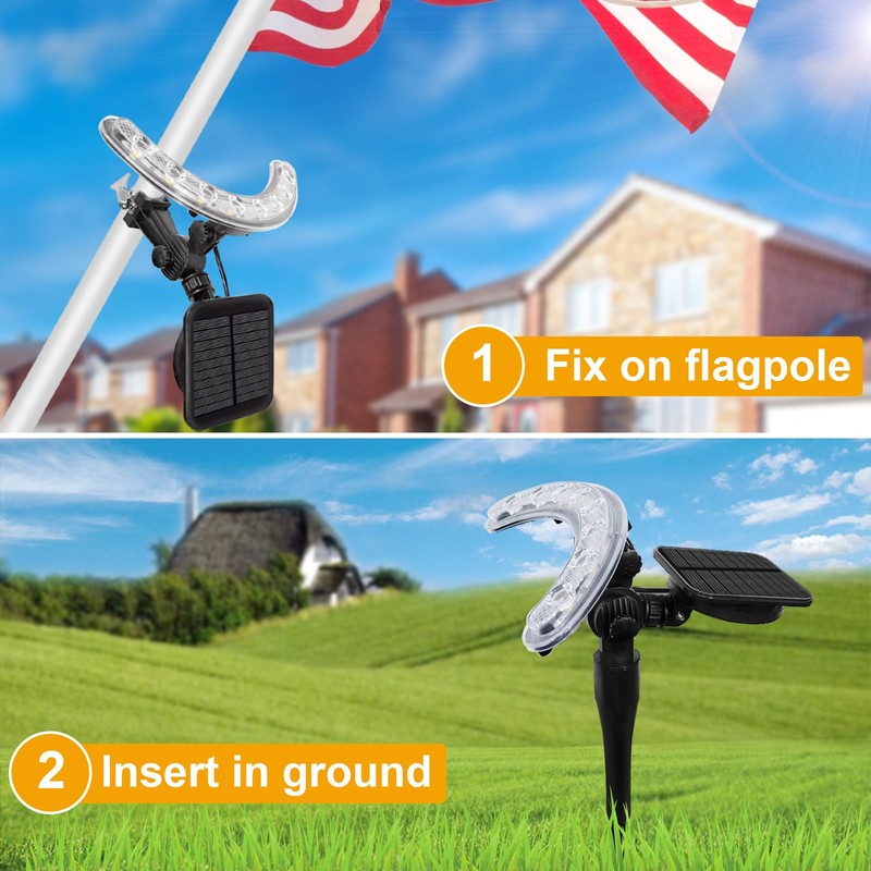 Flagpole Light Solar Powered -one lamp for Three Purposes-7.5 "Adjustable Extension Pole Suitable for 2-6" flagpole - can be Placed in The Garden for Lighting - House Eaves Angled Small Flag Lighting