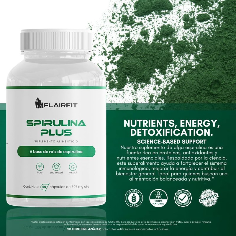 - Complemento nutricional: Flairfit Spirulina Plus 60 Cápsulas contiene 507mg de Spirulina por cápsula, una microalga rica en proteínas, vitaminas y minerales.