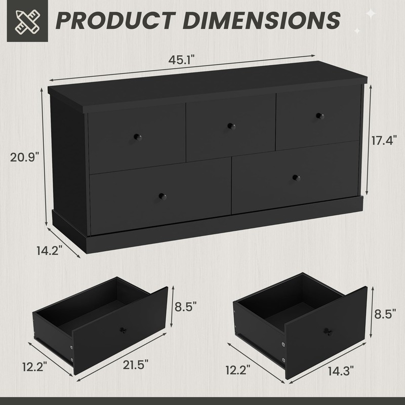 - LARGE CAPACITY STORAGE: This chest of drawers (45.1"L × 14.2"D × 20.9"H ×) is designed with five spacious drawers, providing ample storage space. Whether it's daily necessities, clothing accessories, or office documents, study materials, all can be easily accommodated, making your home or office space more neat and organized.