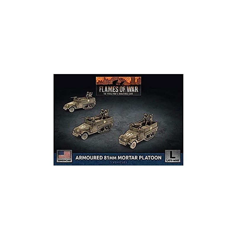 The Flames of War American M4 81mm Armored Mortar Platoon is crafted using high-quality plastic for optimal durability. The armored mortars are ideal for supporting your troops. They can keep up with your half-tracks and don't need to dismount to fire an artillery bombardment, keeping your troops well supported with artillery is the key to success. It contains three M4 (81mm mortar) SP mortar carriers and two unit cards.