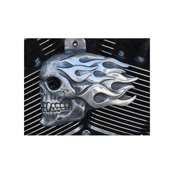 Flaming Skull horn cover in aged aluminum finish. This finish is done in two steps to give it a nice patina. Horn cover Fit '92 and up Harley-Davidsons with side mount "cowbell" horn cover AND all V-rod's. Will fit most earlier models with the purchase of a new (smaller) horn from H-D, part number 69060-90H or any of the aftermarket catalogs. V-rod application requires mounting behind original mounting tab. Use original horn and hardware on all applications.