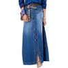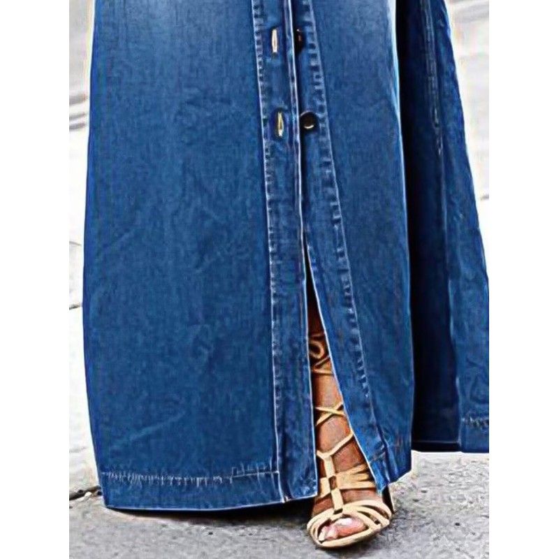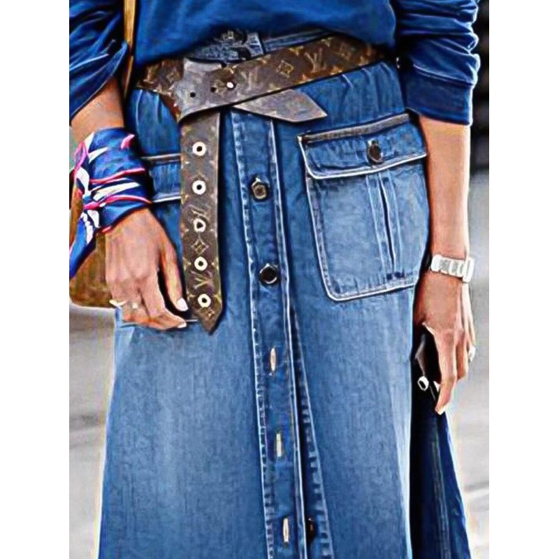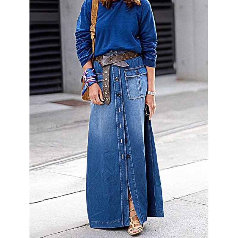 Flamingals A-Line High Rise Vintage Flap Pocket Button Down Maxi Denim Skirt Without Belt Mid Blue L