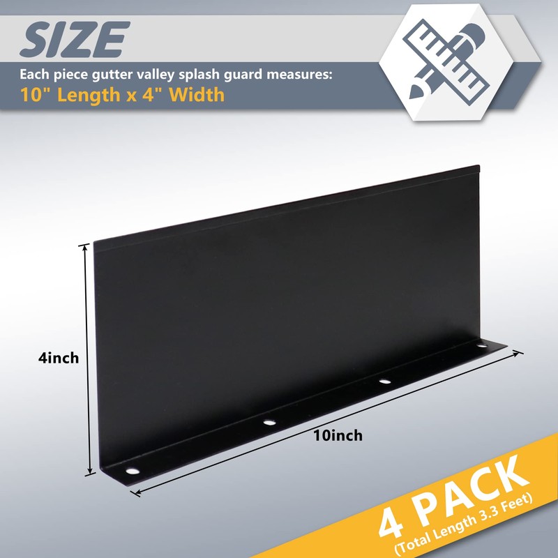 - Size Details - Each gutter valley splash guard measures about 10" L x 4" W, fits most roofs, and keeps the rainwater in the gutter effectively, avoiding overflows.