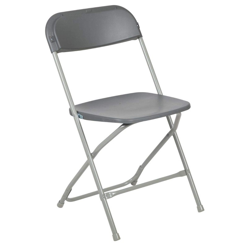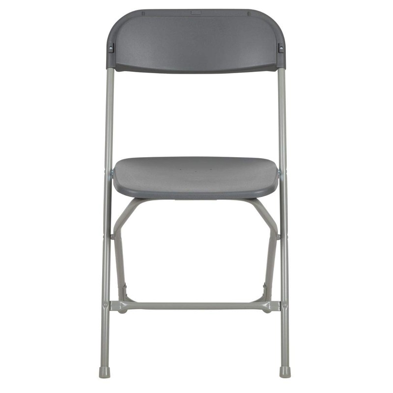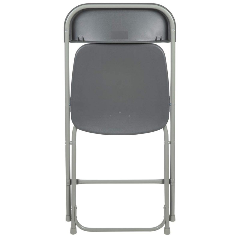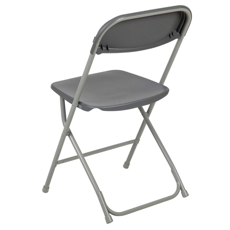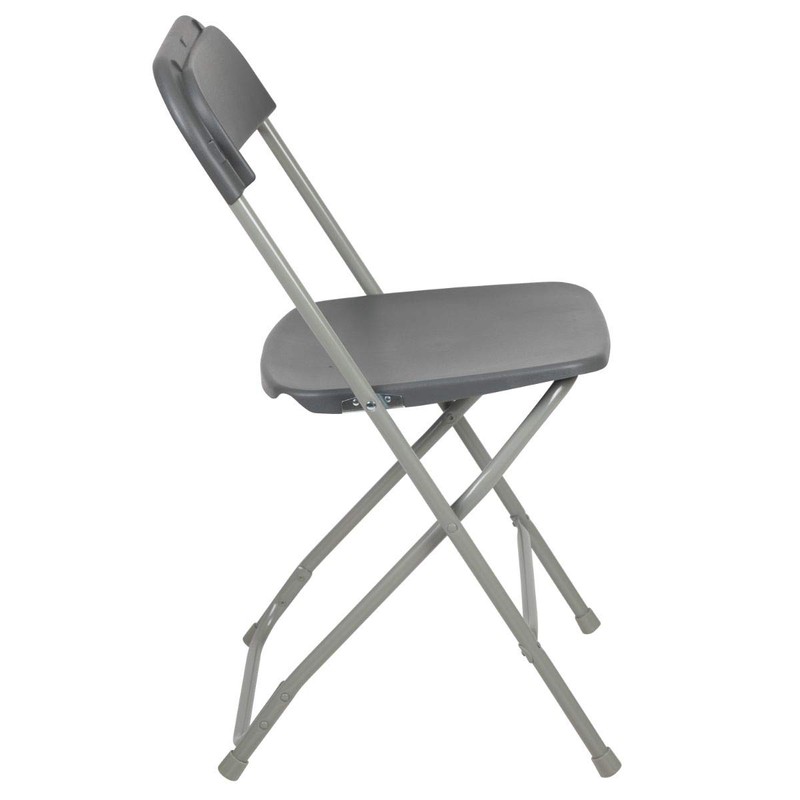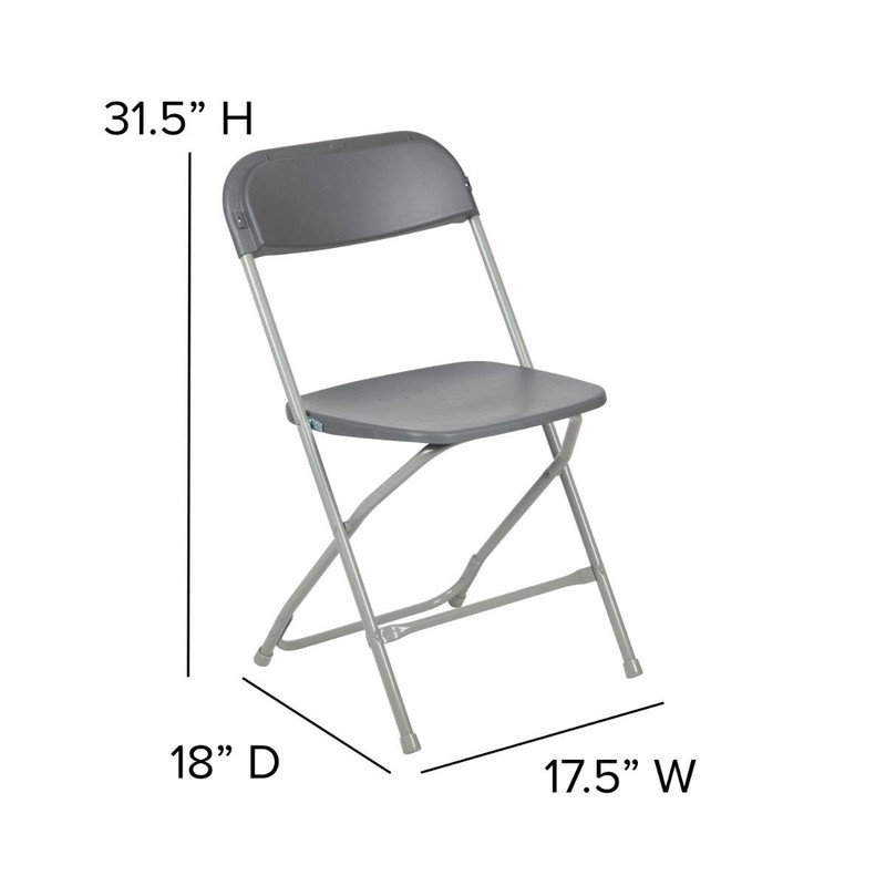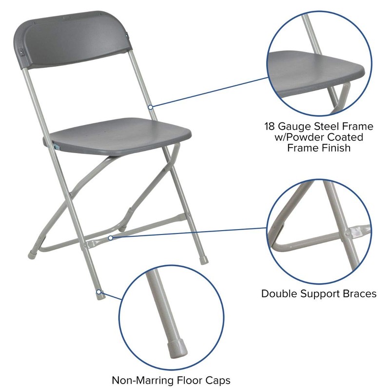 Celebrate the holidays and social gatherings without writing "bring your own chair" on the invite. The 650 lb. Capacity Premium Grey Plastic Folding Chair is a convenient option for weddings, school functions, barbecues, game night, and catering events. Stay comfortable during social events with the gentle contour shaped seat and back. This portable folding chair is popular in the event rental industry due to its lightweight and incredible strength to hold up to 650 pounds of static weight. Additional advantages of our plastic folding chairs include: \- Ready-to-use, no assembly required - \- Stackable storage, chairs stack on top of one another without shifting - \- Drainage holes prevent spills and rainwater from pooling - \- Textured seat adds additional seating security - \- Non-marring floor caps protect hard surfaced flooring - Foldable chairs provide a stress-free on-demand seating solution from group therapy sessions to indoor and outdoor corporate events. These low-maintenance party event chairs wipe down easily after luncheons. Make a smart investment by purchasing multiple plastic folding chairs for your rental business, waiting room or for the next time your company throws an Employee Appreciation Day.