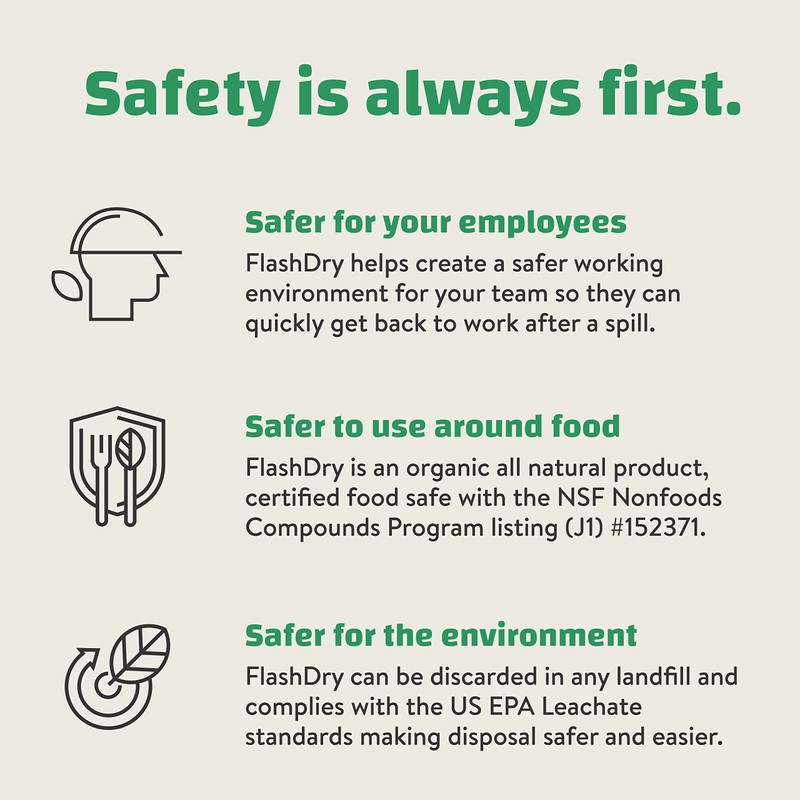 - SAFER FOR PEOPLE: Safer for your employees. FlashDry helps create a safer working environment for your team so they can quickly get back to work after a spill.