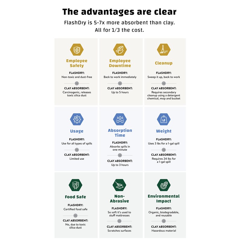 - BETTER THAN CLAY: Flashdry is revolutionizing the way messy industrial spills are cleaned. For decades there has been little innovation in industrial spill cleanup. The most common product used today is clay absorbent. Using clay absorbent is slow, messy and worst of all can be hazardous to employee's health and the environment.