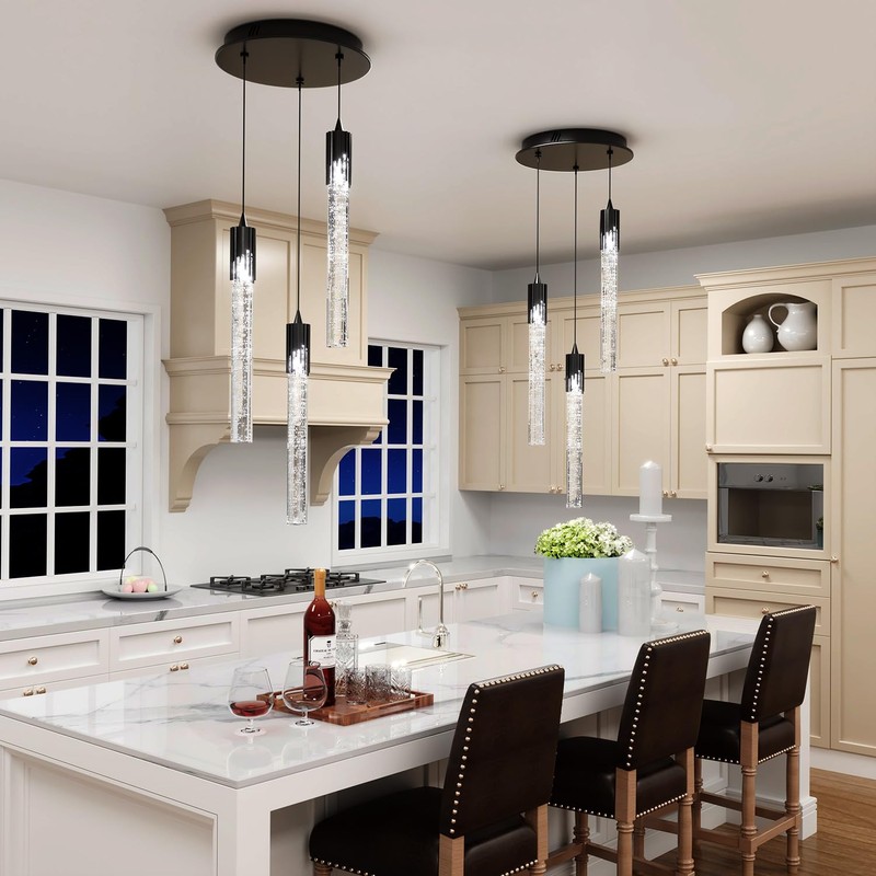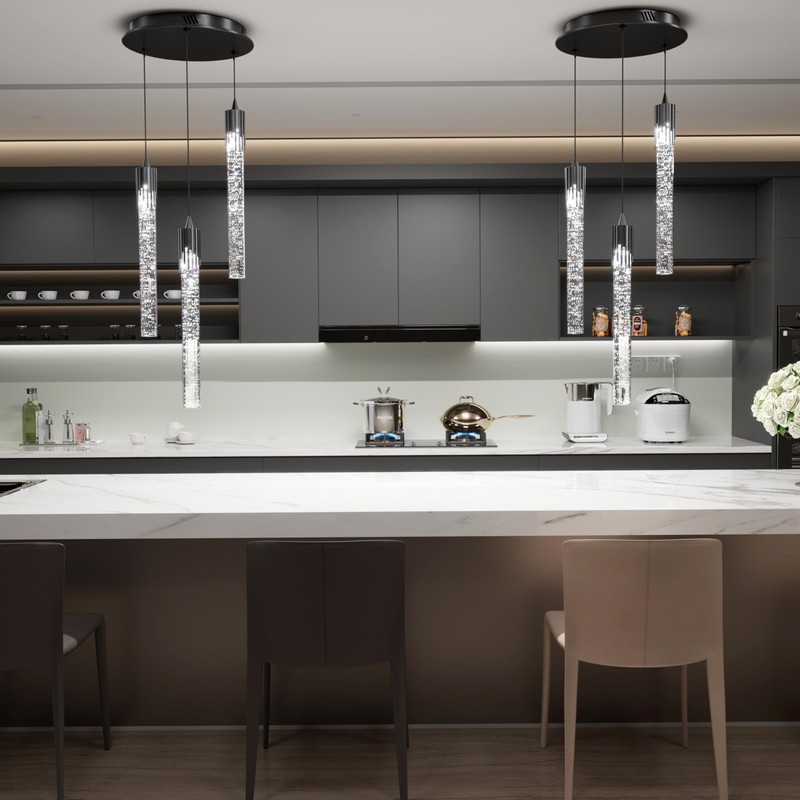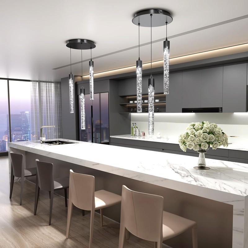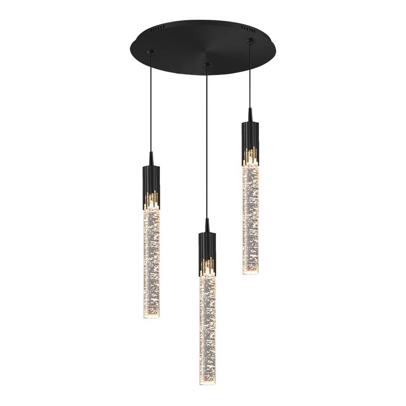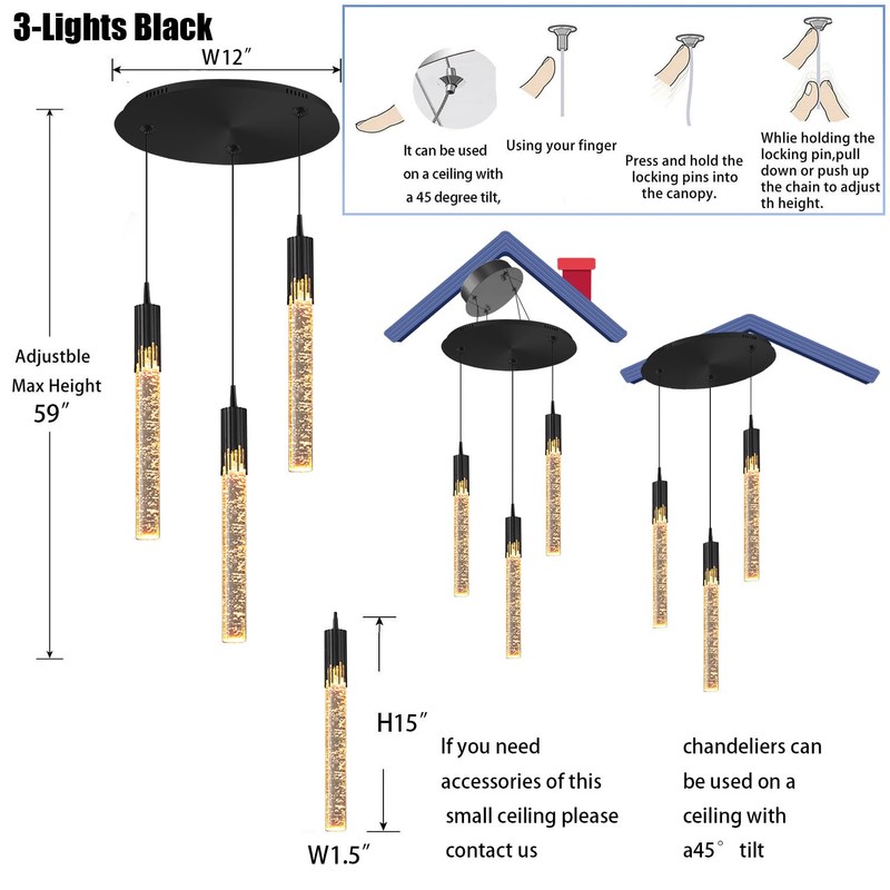 - 【Pendant Light Size】 :3-Light Bubble Crystal Column Chandelier. Crystal column size:W1.5''XH15''. The black circular ceiling pan 11.8''diameter, Pendant Light has a total length of 59''(150cm ), you can freely adjust according to your space.