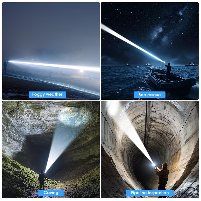 1.Super Bright LED flashlight:Upgrade Long Range LED, illuminate 2000 lumen easily light up over the length of about two football fields100 times brighter than old incandescent lights. 10times Brighter then T6 Flashlight