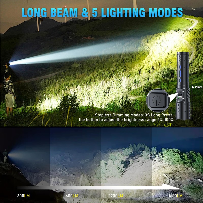 - Stepless Dimming, Zoomable LED Flashlight, : STEPLESS DIMMING Modes: Long press the Button for 2s enter to stepless dimming mode (5%-100% Brightness); Combine with Zoomable Function : work as a spotlight when zoom out , and also can be used as a floodlight when zoom in. This LED Tactical Flashlight is widely used in outdoor survival activity, like camping, hiking, fishing, BBQ, dog walking or any outdoor activities.