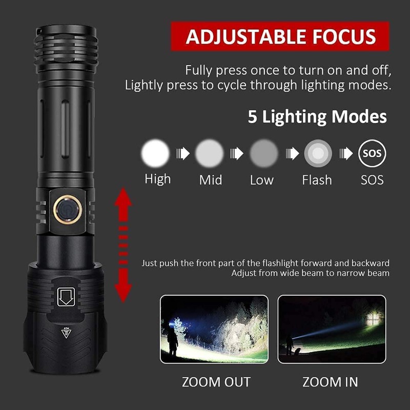 - 【Super Bright】This flashlight 1200000-lumen (max) LED combines with PDO technology for extreme lighting performance. Features High / Medium / Low / Strobe / SOS modes function.Easy to change modes by pressing the switch button gently.Stretch the head of the flashlight to change the focal length.Astigmatism is suitable for large-area lighting.Spotlight flashlight is suitable for long-distance lighting.