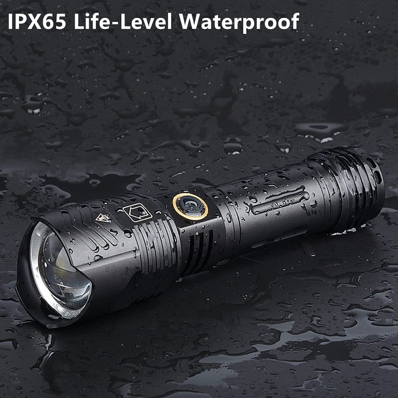 - 【IPX65 WATERPROOF & Durable】IPX5 waterproof tactical flashlight can be used normally in any bad weather such as rain or snow. Heavy duty flashlight with durable aluminum body and shock-resistance endure rough handling. It is normal to use even when it is raining and snowing. It's very suitable for camping, emergency flashlight.