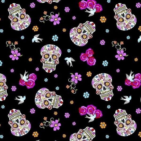 FlashPhoenix Quality Sewing Fabric - Day of The Dead Fabric - Glitter Sugar Skull Toss Black - Yard 36 x 44 Inch
