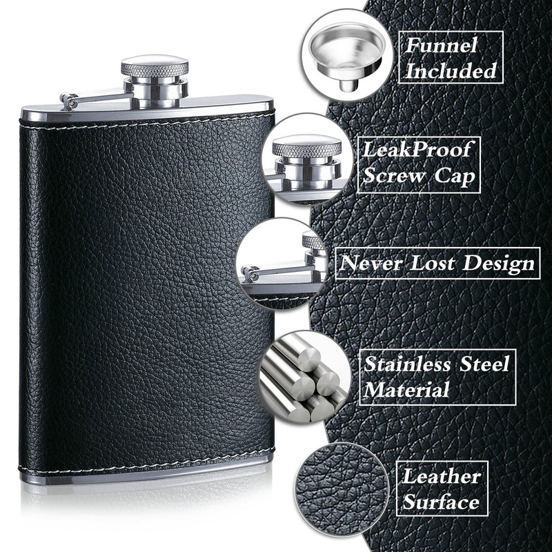 • Material: Flask made of stainless steel, very good corrosion resistance, durable, accompany you for a long time, wrapped in black leather, not only luxury and comfortable to hold, leather does not have any bad smell, excellent appearance, reliable quality