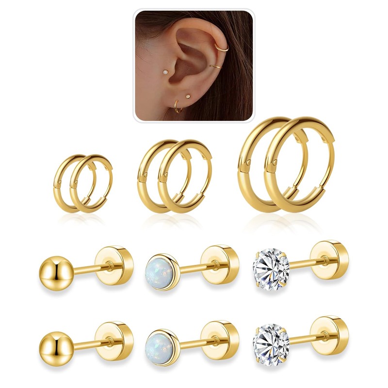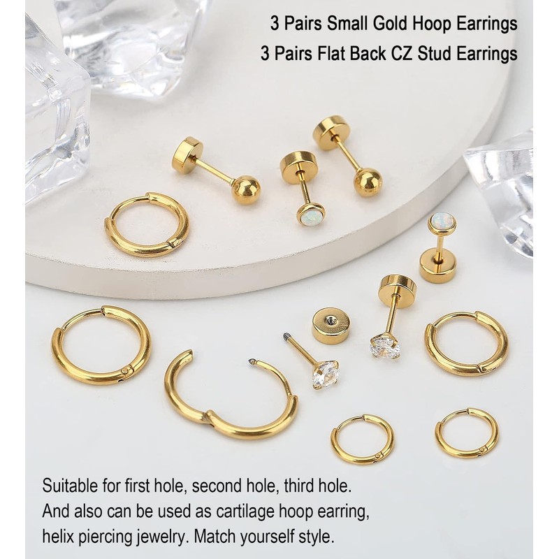 - [Multipack Lightweight Earrings Sets for Multiple Piercing]--Includes 3 pairs small gold huggie hoop earrings and 3 pairs flat back tiny cubic zirconia stud earrings a set. Suitable for first hole, second hole, third hole. And also can be used as cartilage hoop earring, helix piercing jewelry. Match yourself style.