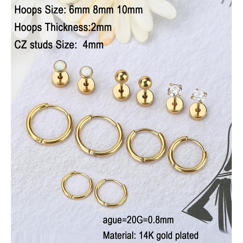 Flat Back Stud Earrings and Small Hoops Earrings Sets for Multiple Piercing for Women Men,Lightweight 14K Gold Plated Small Huggie Hoop Earrings Flat Back Tiny 4mm Ball/Opal/Cubic Zirconia Stud Earrings for Cartilage, Helix, Lobe,Hypoallergenic(6 Pairs)