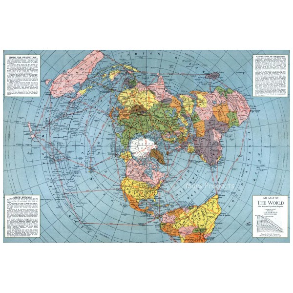 Flat Earth Map Polar Azimuthal Equidistant Projection 1943 WWII Poster 20x30