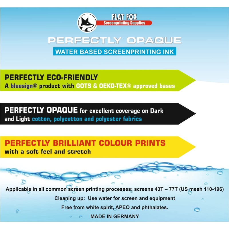 Flat Fox Perfectly Opaque Waterbased Screen Printing Inks are available in 21 colours in 3 different sizes. For printing onto light and dark fabrics Suitable for cotton, polycotton and polyester Brilliant colour prints with a soft feel and stretch.These are PERFECTLY OPAQUE inks for good coverage. PERFECTLY ECO FRIENDLY : Our inks are made from Product class 1 Öko Tex Standard 100 certified bases which are Global Organic Textile Standard (GOTS) approved. They are manufactured with the strictest requirements and limit values and carry the bluesign approved label meeting the strict ecological and toxilogical criteria of the bluesign system. bluesign provides the highest level of consumer safety. It promotes environmentally and socially friendly products. Recommendation for Use: Before going into production we recommend making it a rule first to test the suitability of the print pastes for the substrates to be used as to their wash fastness. Be careful of excess dyes in polyester fabric which can migrate into ink colours when heat is applied to cure. Viscosity of the ink can be decreased by adding small amounts of water (up to 10 %). Curing Inks / making inks wash fast Once dry the inks can be cured at 160°C for 30-40 seconds using a heat press. You can use an iron and other methods for curing but always do wash tests. Wait at least 1 hour after curing before doing a wash test and make sure inks are completely dry before curing.  Printing Process: Applicable in all common screen printing processes; screens 43T – 77T depending on the design and fabric quality. Best possible coverage as well as colour brilliance is achieved by repeated printing with intermediate drying or printing colours onto a white underbase. Use pallet adhesive to keep your fabric from moving between prints. For maximum coverage and best results, print through lower mesh counts 43T/55T. Cleaning up:  Use water for screen and equipment