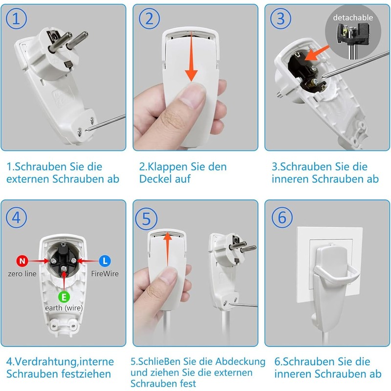 - Plug size: European plug size is 8.7 x 4.2 cm, suitable for 3-core cables and core diameter 1.5 mm². Schuko corner plugs feature built-in U-shaped grooves and mounting screws to keep the wires clean and stable so they do not mess up or fall off