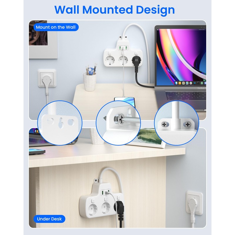 - Power strip 2 metre cable: The power strip comes with a 2 metre power cord, providing great expandability to meet the power needs of different locations. There are 3 holes on the back for hanging the wall. You can attach it firmly to the wall or next to the table with screws. Especially suitable for use in offices, bedrooms and kitchens.