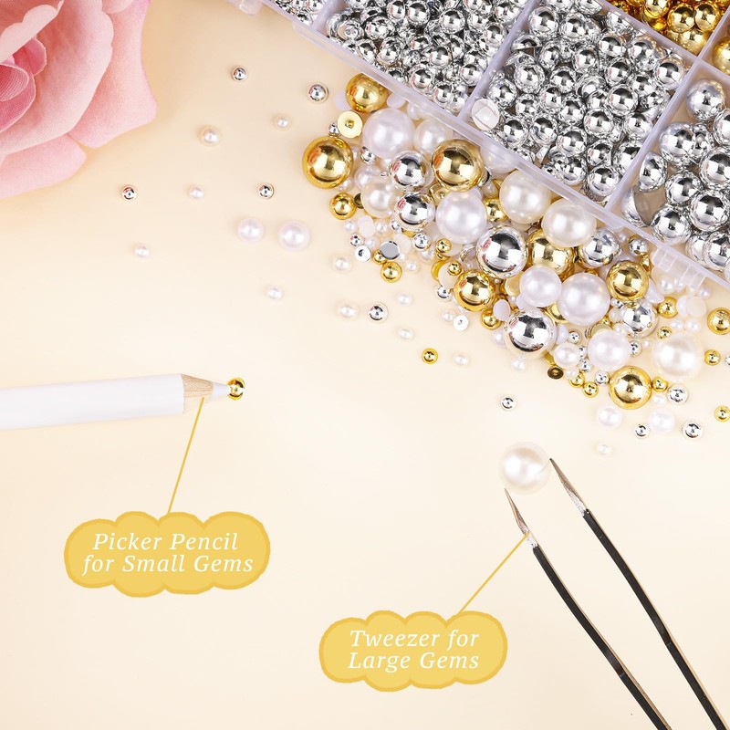 Flatback Pearls for Crafting, Gold/Silver/Beige/White 3-10mm Half Pearls with Pickup Tools, Bedazzling Beads for DIY Crafts Nail Art