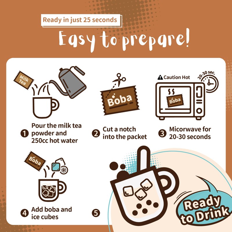 - DESIGNED FOR BUSY PEOPLE ON THE GO Our instant tapioca pearls provide a quick and convenient beverage solution for those with packed schedules—like workers, parents, and students. With no preparation, cooking, added sugar, or refrigeration needed, simply microwave and add water! This instant boba treat is perfect for busy individuals who want an easy, on-the-go option.