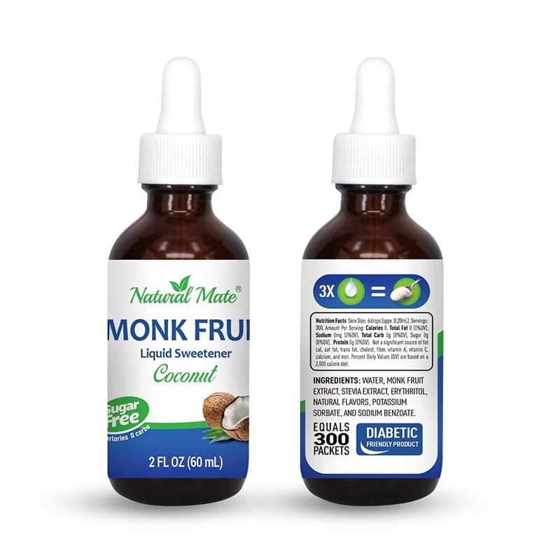 - Coconut flavored liquid monk fruit sweetener 2.0 FL OZ / 60 mL