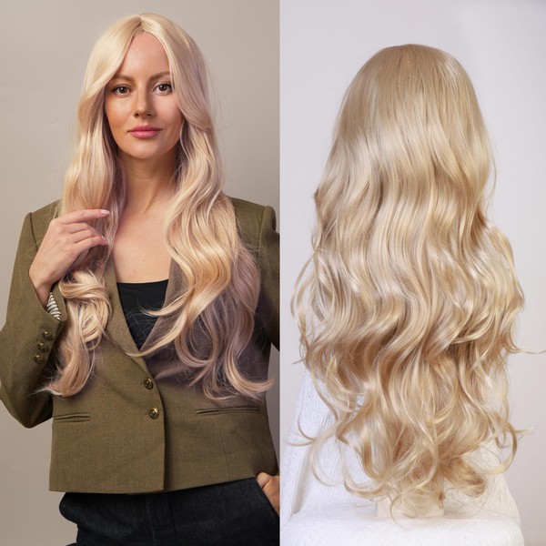 Flaxen Wig Long Middle - part Curly Wavy Style Women's Wig with Glue - free Heat - resistant Hair Strands Suitable for Parties Dances Shows Dress - up (Comes with Wig Cap) 27 Inches