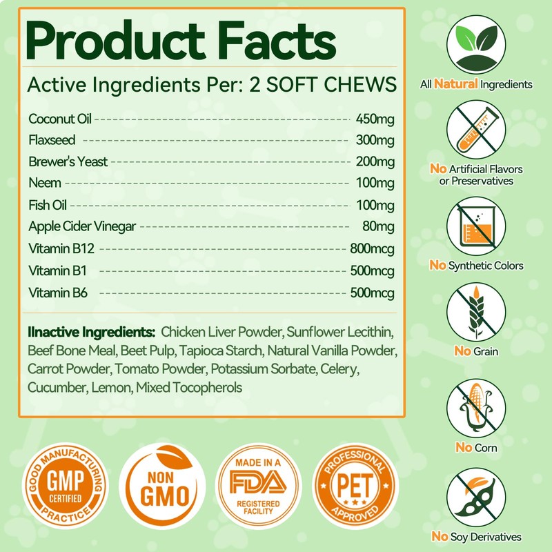 Active Ingredients: | coconut oil, flaxseed, brewer's yeast, neem, fish oil, apple cider vinegar, vitamin B12, vitamin B1, and vitamin B6 |