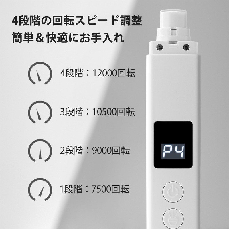 - (Durable Material & 4 Level Power Adjustment) Adopts Kongolite polishing head and brass shaft for a durable design. With 4 adjustable power levels of 7,500 to 1,2000 rotations, it is suitable for a wide range of pets, from small to large dogs, and cats. The high speed rotation allows you to adjust your nails smoothly and in a short time, reducing stress on your pet