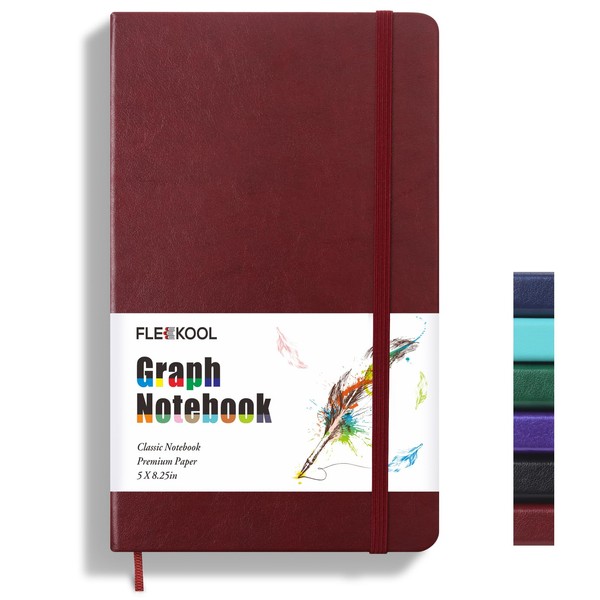 FLEEKOOL Graph Paper Journal Notebook, Leather Graph Grid Notebook with 100gsm Thick Graph Paper, 5 inches x 8.25 inches, Hardcover, Inner Pocket-Burgundy