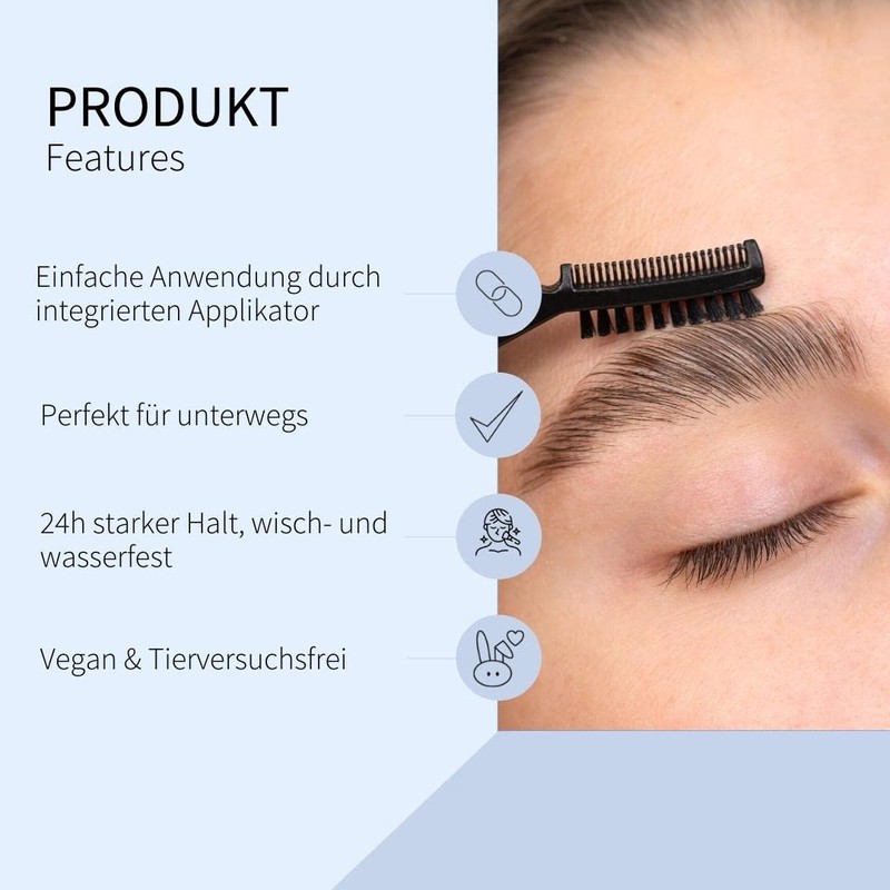 Our set of 3 includes all the products you need to shape, shade, fill and define your brows. Brow Fix: Thanks to the uniquely perfect formula of wax and gel, your eyebrows can be easily shaped into the desired shape. Brow pomade: the brow pomade on cream base gives your eyebrows deep and a smooth, matte finish. Brow micropen: with the highly pigmented 3D brow micropen with particularly fine mie, individual eyebrow hairs can be easily traced. So you can conjure up in no time at all, smudge-proof, natural and perfectly completed eyebrows.