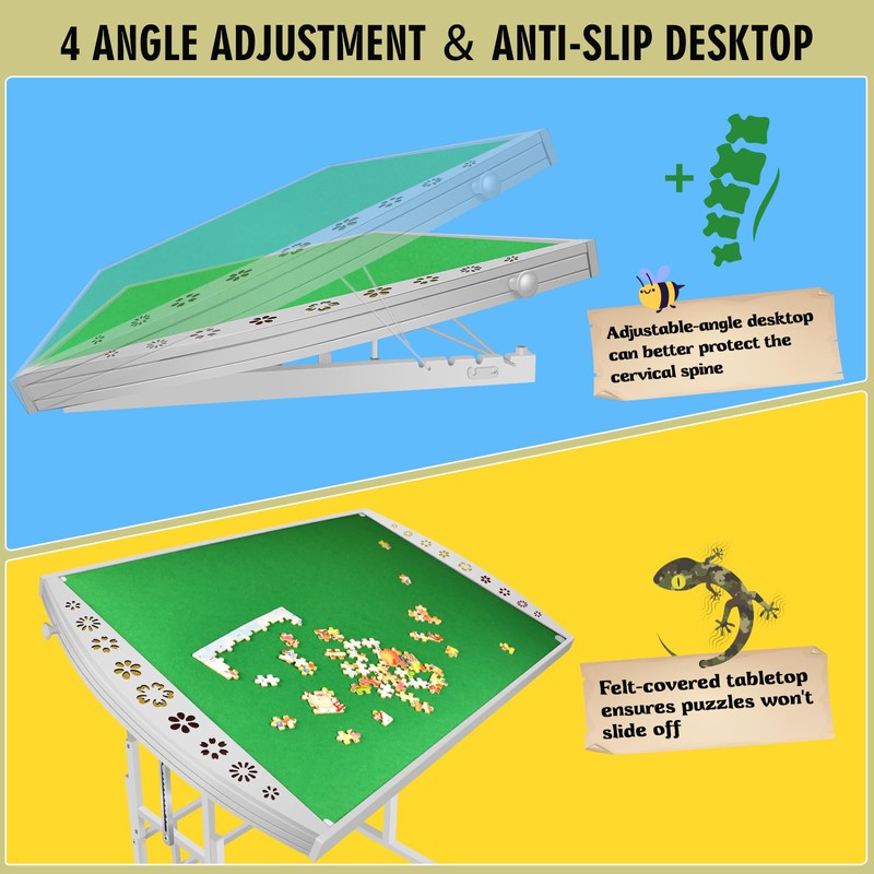 • PUZZLE TABLE WITH ADJUSTABLE ANGLE AND HEIGHT: The puzzle table top part can be adjusted to 4 different angles to tilt according to your usage, To protect your neck and back, with no neck craning. puzzle board can better provide a comfortable position for puzzle lovers. puzzle table with drawers can be adjusted at any adjustable 10 height, between 29.5’’to to 35’’, allowing you to change depending on your comfort and height