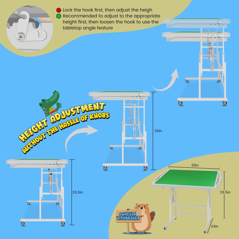 • EASY TO MOVE PUZZLE TABLE WITH WHEELS: A puzzle table with 4 Universal Castors, can be easily moved anywhere, any roller wheels can be locked to hold the jigsaw puzzle board where you want it. One person can assemble, move, and disassemble the puzzle table. Tips: When you need to adjust the height of the puzzle card table stand and the angle of the puzzle board, it is best to fix the wheels of the jigsaw easel table first to get a happy experience