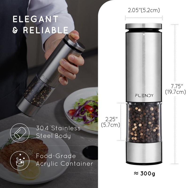 - ELEGANT & FUNCTIONAL: Flendy electric pepper grinder Rechargeable crafted with stainless steel, features an oversized float disk button, easy to control grind amount with one-hand operation