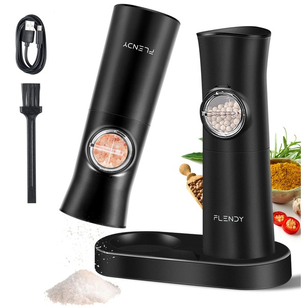 FLENDY Gravity Electric Salt and Pepper Grinder Set Rechargeable, Automatic Salt and Pepper Grinder Set with USB C Charging Base, Lithium Battery, Adjustable Coarseness, LED Light, and Dust Cap, 2PCS